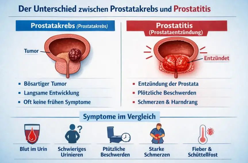 Dieser Artikel erklärt verständlich und umfassend, worin genau der Unterschied zwischen Prostatakrebs und Prostatitis besteht. Sie erfahren, welche Symptome auftreten können, welche Risikofaktoren eine Rolle spielen und welche modernen Diagnose- und Behandlungsmöglichkeiten heute zur Verfügung stehen. Ziel ist es, Unsicherheiten abzubauen und eine fundierte Orientierung für Betroffene und Angehörige zu bieten.