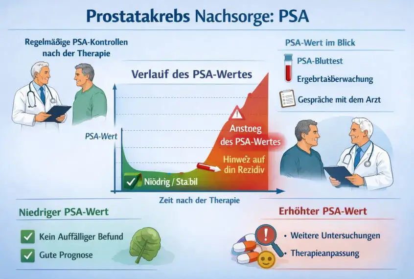 Der PSA-Test (Prostata-spezifisches Antigen) ist dabei das wichtigste Instrument. Nach einer erfolgreichen Behandlung sollte der PSA-Wert deutlich sinken oder sogar nicht mehr nachweisbar sein. Ein erneuter Anstieg kann ein Hinweis auf ein Rezidiv sein und weitere Untersuchungen erforderlich machen.